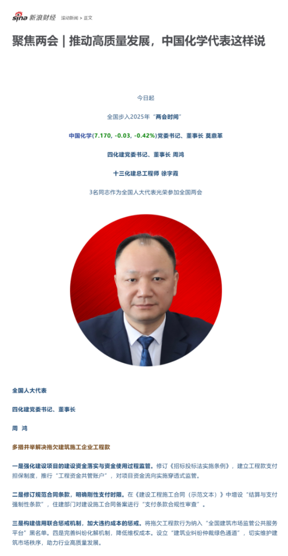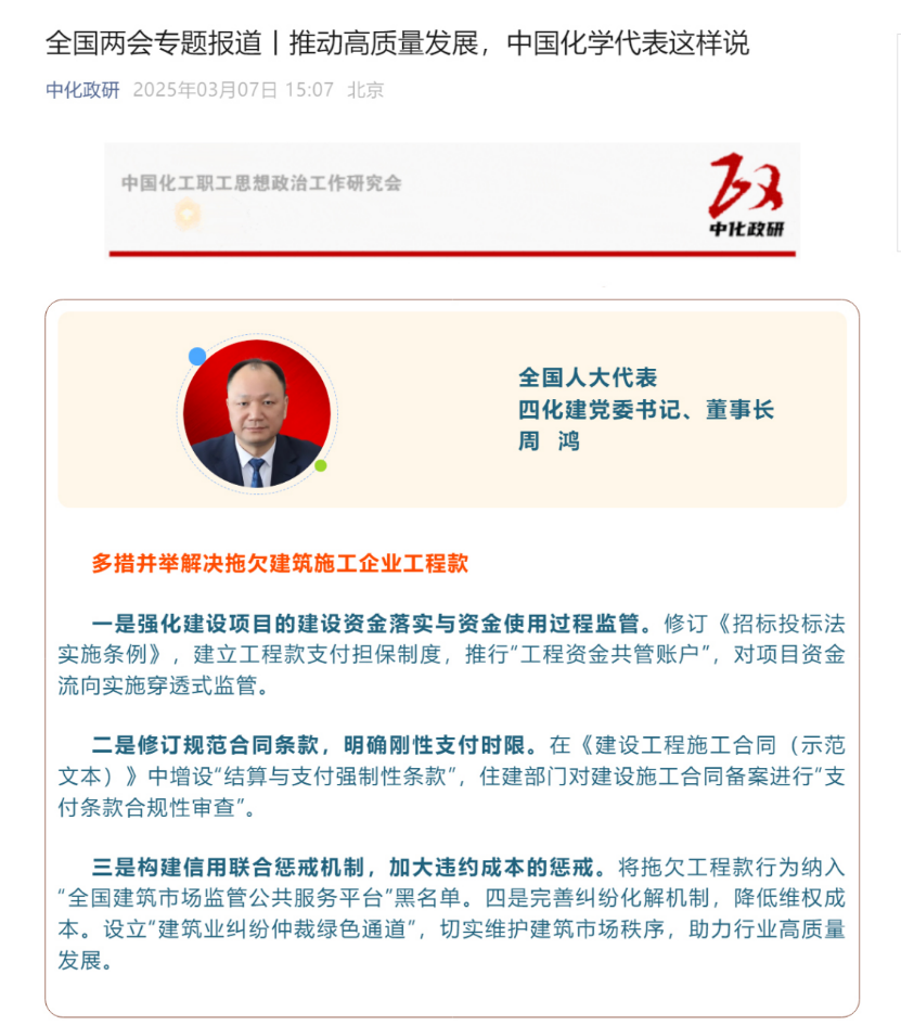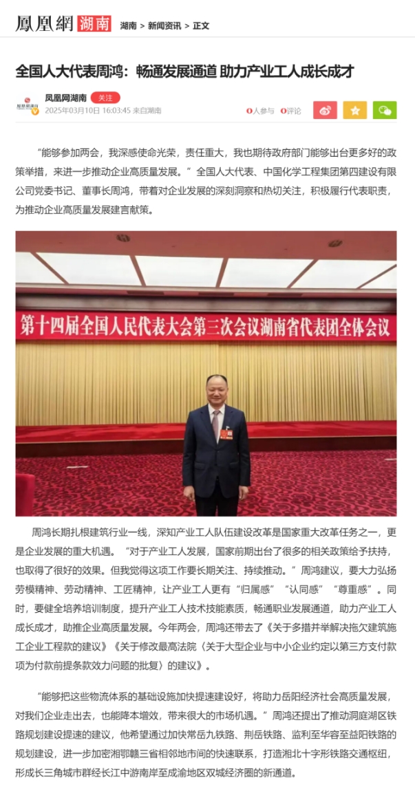 2025年全國(guó)兩會(huì)期間,全國(guó)人大代表,中國(guó)化學(xué)四化建黨委書(shū)記、董事長(zhǎng)周鴻向大會(huì)提交《關(guān)于加強(qiáng)產(chǎn)業(yè)工人隊(duì)伍建設(shè)的建議》《關(guān)于多措并舉解決拖欠建筑施工企業(yè)工程款的建議》《關(guān)于推動(dòng)洞庭湖區(qū)常岳九鐵路、荊岳鐵路、監(jiān)利至華容至益陽(yáng)鐵路規(guī)劃建設(shè)提速的建議》《關(guān)于修改最高法院〈關(guān)于大型企業(yè)與中小企業(yè)約定以第三方支付款項(xiàng)為付款前提條款效力問(wèn)題的批復(fù)〉的建議》等4條建議,受到主流媒體深入報(bào)道,引起社會(huì)各界廣泛關(guān)注。