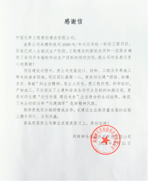 近日,由江西公司承建的4000噸/年對位芳綸一標段工程項目全面進入試生產階段。項目團隊憑借高效履約能力與卓越服務,贏得業主單位河南神馬芳綸技術開發有限公司的高度認可,并發來感謝信,肯定團隊的專業實力與責任擔當。