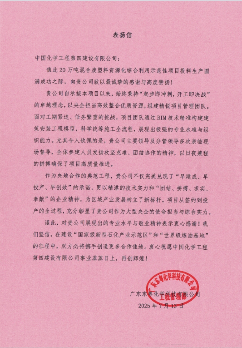 近日,中國化學四化建被廣東東粵化學科技有限公司授予“優秀承包商”稱號,并收到其發來的表揚信,對公司承建東粵化學20萬噸/年混合廢塑料資源化綜合利用示范性項目期間展現的專業實力、央企擔當與拼搏精神給予高度評價,盛贊雙方是合作共贏的典范。