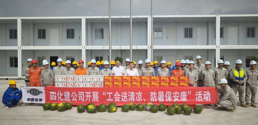 近日,岳陽市總工會黨組書記、副主席林治學到中國化學四化建中南公司、中化勞務公司承建的岳陽云溪天辰大道項目看望慰問一線職工,送去藿香正氣水、夏桑菊顆粒、西瓜等防暑物資。林治學現場察看項目建設情況,了解施工難點和安全措施,肯定項目推進成效,強調要將職工安全健康放在首位,落實高溫勞動保護規定,科學安排作息,改善作業環境,預防事故發生,確保安全優質按期完成項目建設。